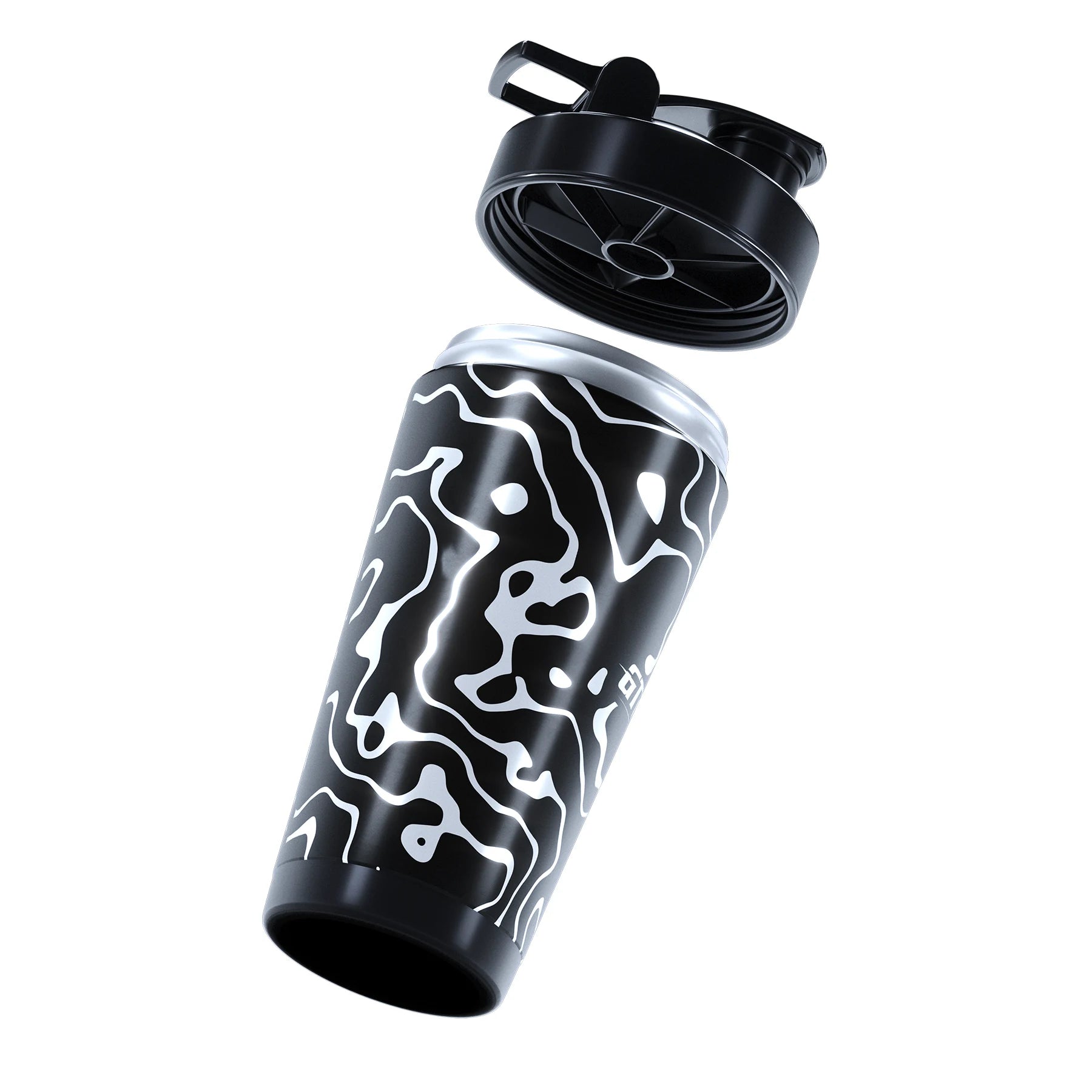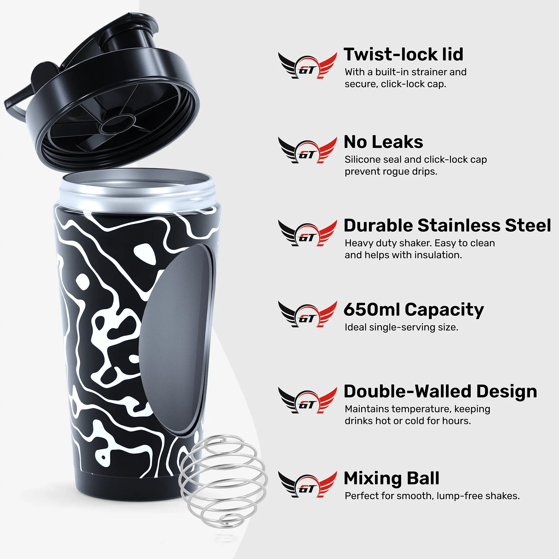 A. This shaker features a screw on lid and secure seal to prevent leaks, even when shaken or stored on its side.