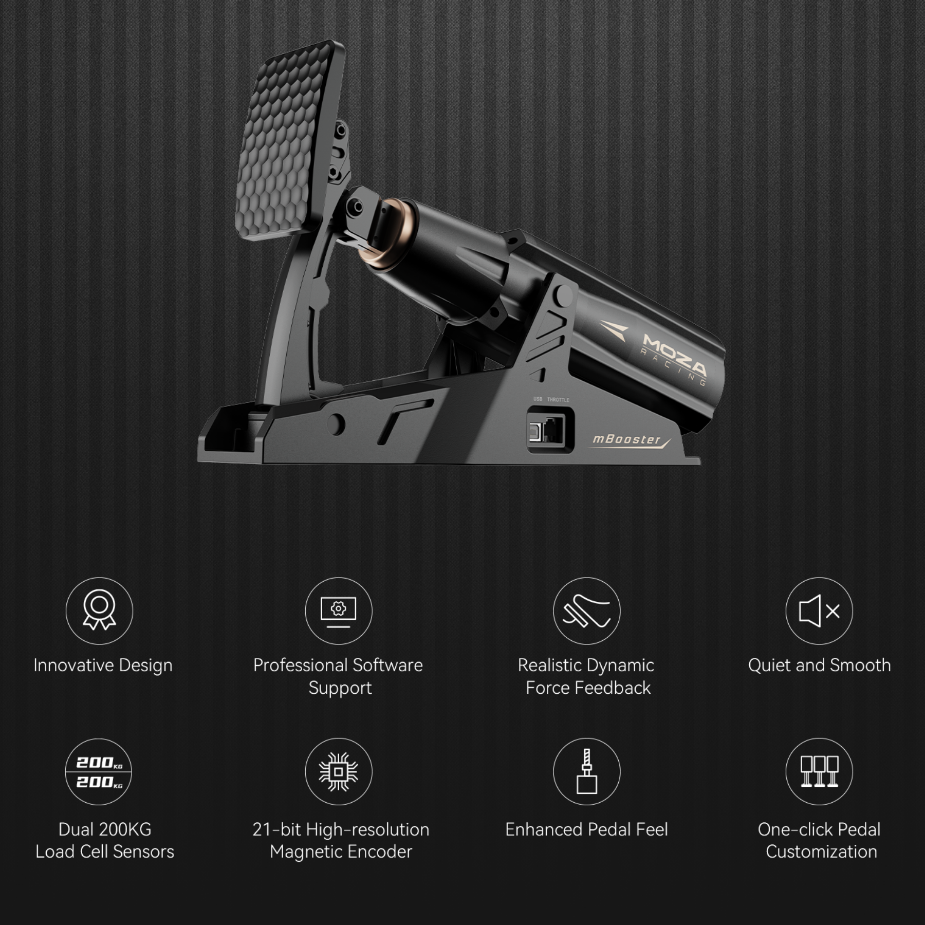 Experience unparalleled realism and control with the MOZA mBooster Active Pedal Set. Featuring an intelligent force feedback system that simulates ABS, traction control, gear shifts, and G-force effects in real-time, this set includes the advanced mBooster Active Pedal and a CRP2 Throttle. Customize pedal feel with one click using MOZA Pit House software—no mechanical adjustments needed. Built with dual 200KG load cell sensors, a 21-bit magnetic encoder, and a high-torque motor, it delivers precision, smoothness, and reliability for competitive sim racing.